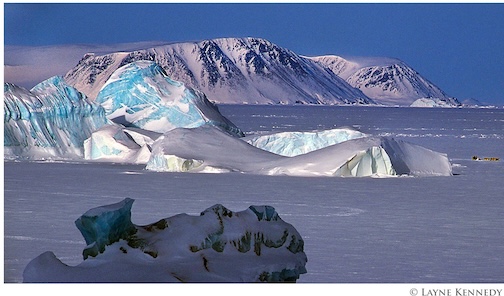 For a sense of scale, frozen Baffin Bay along the western coast of Greenland, an Inuit dogsledding team (middle right), by Layne Kennedy.