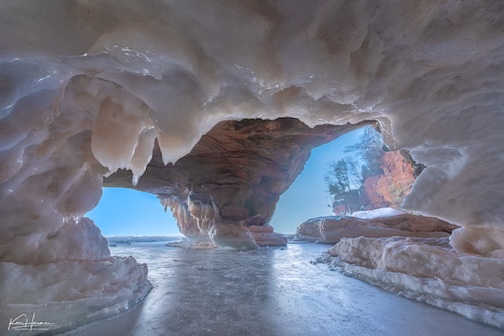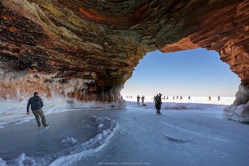 Skating in an ice cave on Tuesday, Feb. 17, by Bryan Hansel. On Wednesday, 45+ mph winds broke up the ice on Lake Superior, and the ice caves were closed.