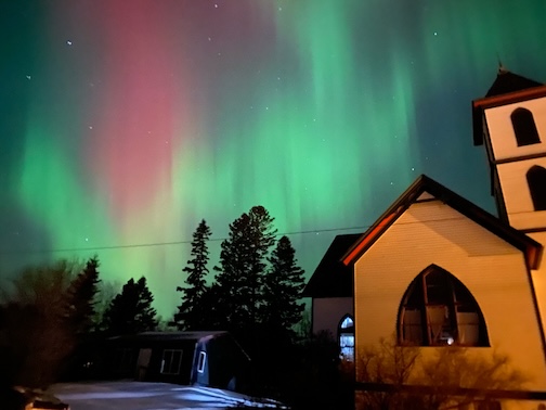 Northern lights in Grand Marais last night by Ann Ward. The building at right is the Betsy Bowen Studio and Gallery.