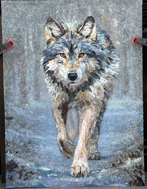 Mosaic wolf, made out of stained and tempered glass after a photo by Steve Gatz. Art by Caroline Emily.